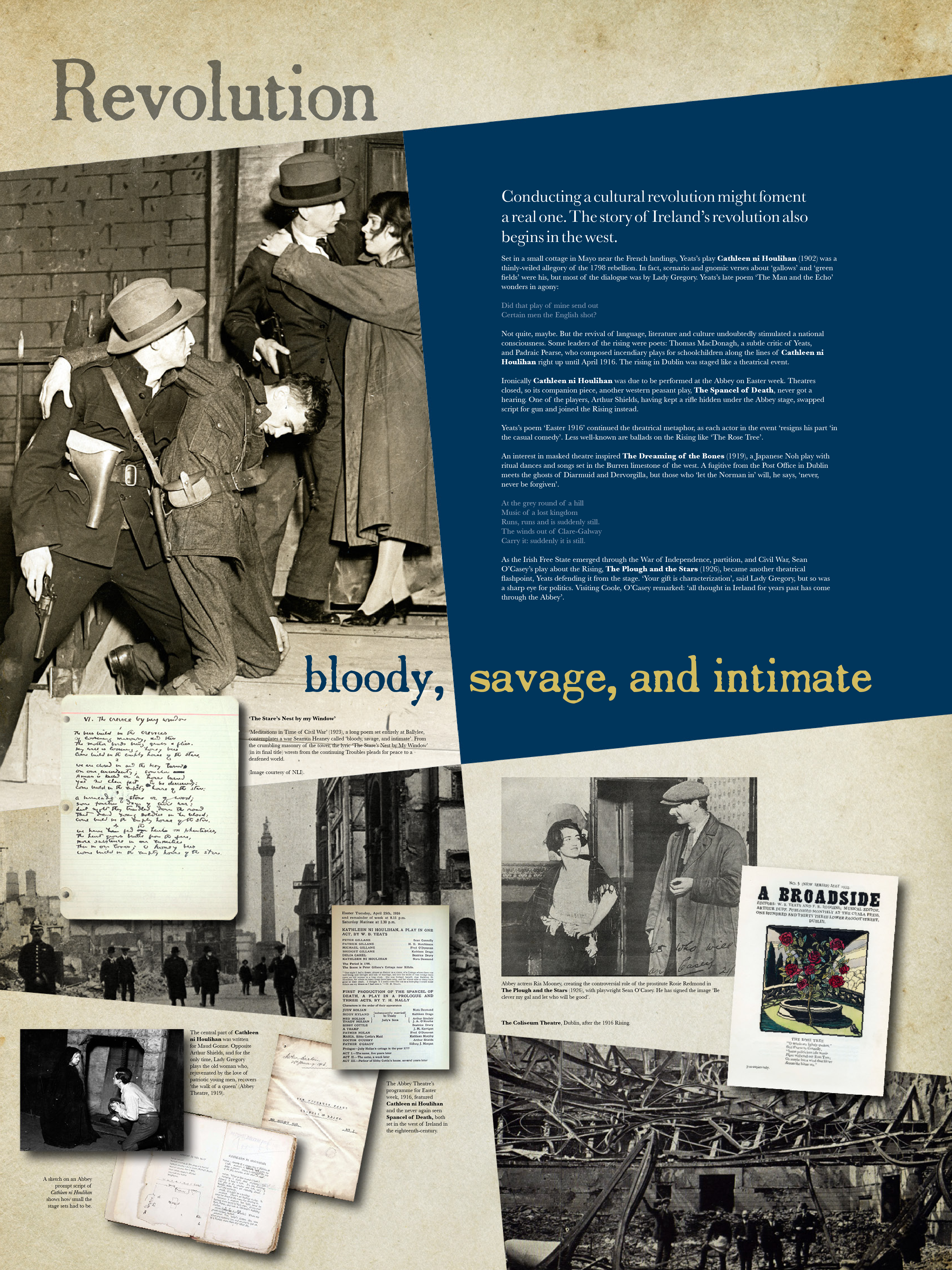 Yeats & the West follows the formation of the Abbey Theatre in Galway, and Yeats’s work with J.M. Synge, George Moore and Edward Martyn, using exclusive materials from NUI Galway’s Lady Gregory Collection, the Abbey Digital Archive, and the Lyric Theatre Belfast. It follows his foundation of Thoor Ballylee as a poetic symbol. It explores his obsession with local poet Antoine Ó Raifteirí, and highlights the gifted artists of Yeats’s own family, whose pioneering work is showcased in exquisite handprinted books and in embroidery from Loughrea’s St. Brendan’s Cathedral.