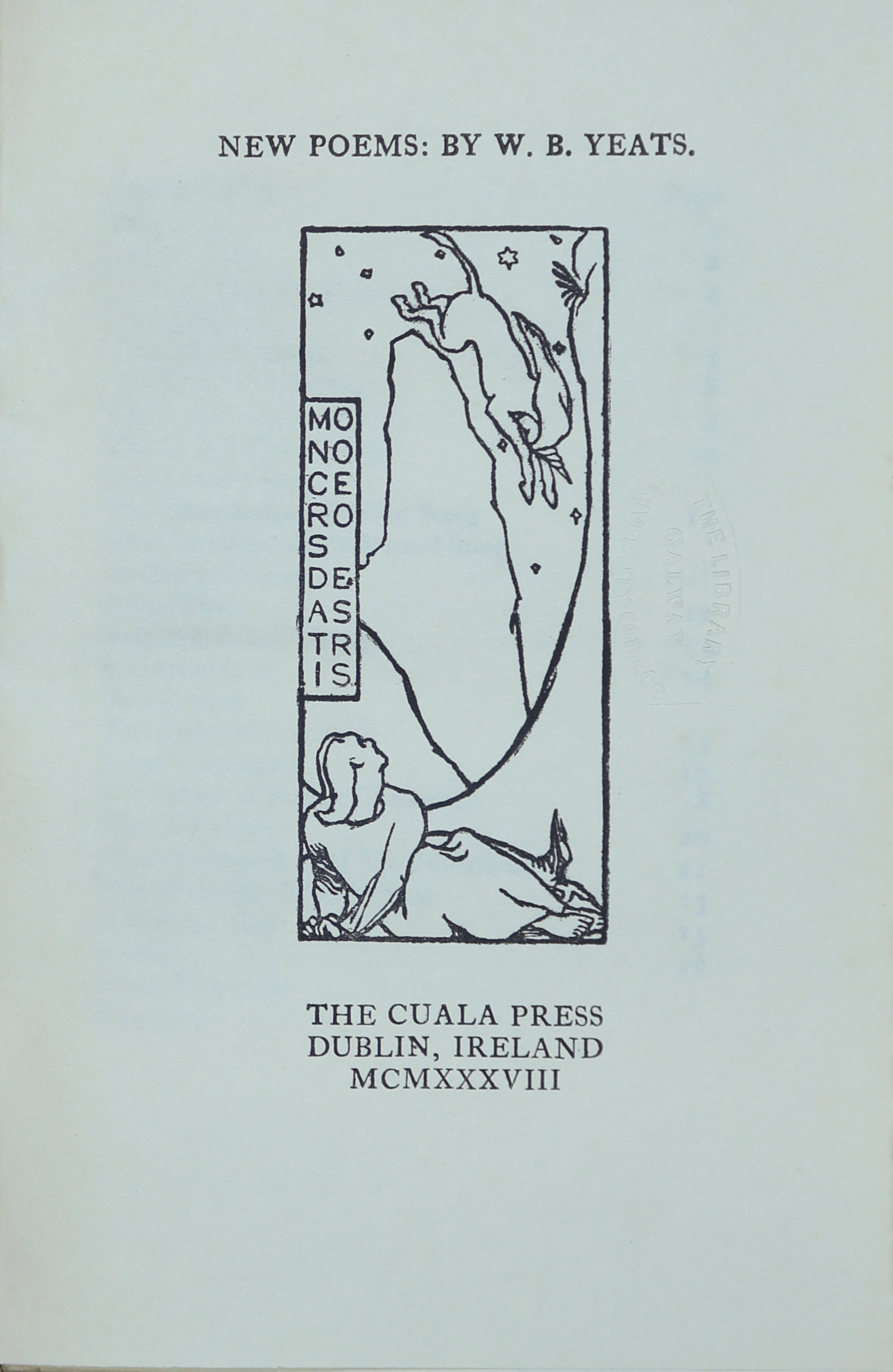 But rather than finish on such an ending, we finish this trot around the equestrian highlights of the exhibition somewhere altogether stranger. A new beginning is suggested by a more mystical image from Thomas Sturge Moore, which appeared at on the title page of the Yeats family’s Cuala Press books for years. This is from the Cuala Press edition of W.B. Yeats’s New Poems (1938), full of ballads and the strange Dionysian energy of Yeats’s late style. The illustration was originally conceived for Yeats and Augusta Gregory’s play The Unicorn from the Stars (1908), which through a character rejecting material existence itself reworks Yeats’s play Where There is Nothing (1902) (‘where there is nothing, there is God’).